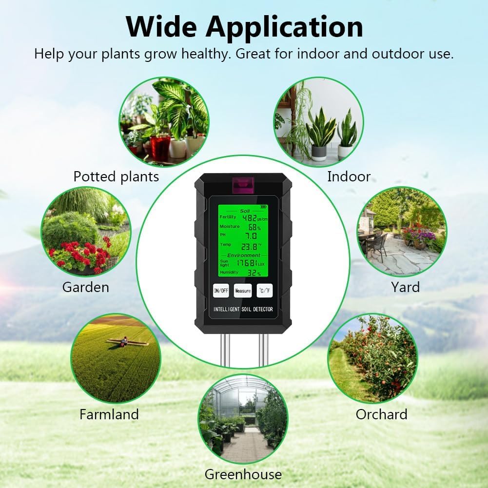 VERSATILE FUNCTIONALITY: 6-in-1 Soil Moisture Meter measures moisture levels, pH, Temperature, Moisture, Sunlight, Air Humidity, Soil Fertility Meter for optimal plant care and growth monitoring to help you take better care of flowers and plants. Perfect for gardeners who want smarter growing